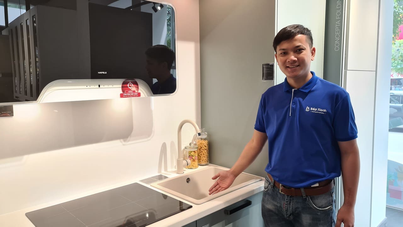 Bạn nên kết hợp chậu rửa chén đá Granite với mẫu vòi đồng thau mạ đá của Hafele để tăng tính đồng bộ cho bếp. Và với mẫu chậu đơn gọn như thế này, bạn chỉ cần chọn vòi thiết kế đơn gian chứ không cần phải kết hợp với vòi có dây rút.