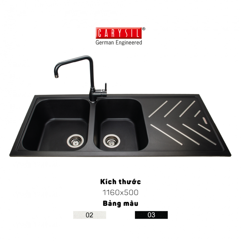 Mẫu chậu rửa chén 2 hố – 1 cánh với dải xương cá cách điệu nổi trên bề mặt chậu là 1 trong những thiết kế khác biệt của Carysil. Sản phẩm có không gian sử dụng lớn cho phép khách hàng có thể thao tác sử dụng cùng lúc nhiều thứ – như vừa rửa vừa cắt gọt và vừa để khô các dụng cụ mà vẫn thoải mái trong hoạt động nội trợ.