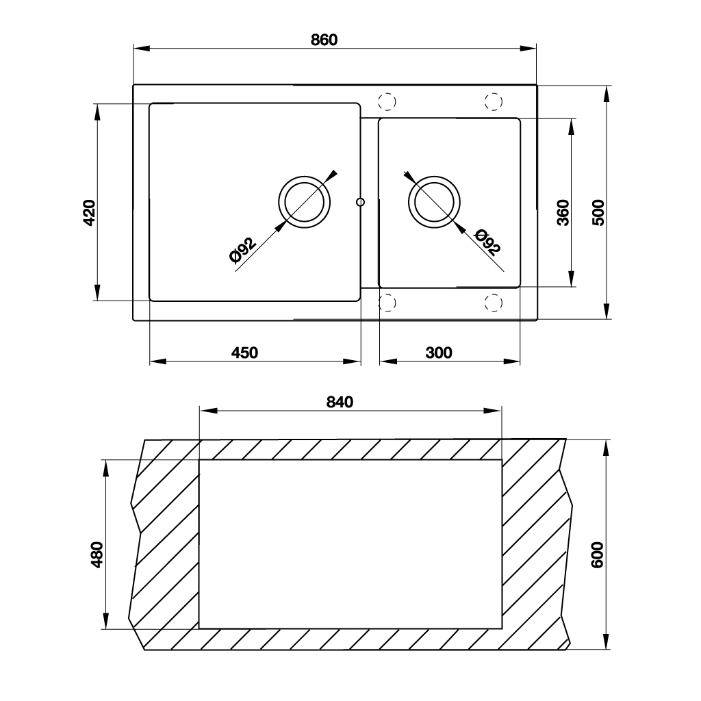 | Kích thước cắt đá: 840D x 480R mm. | |