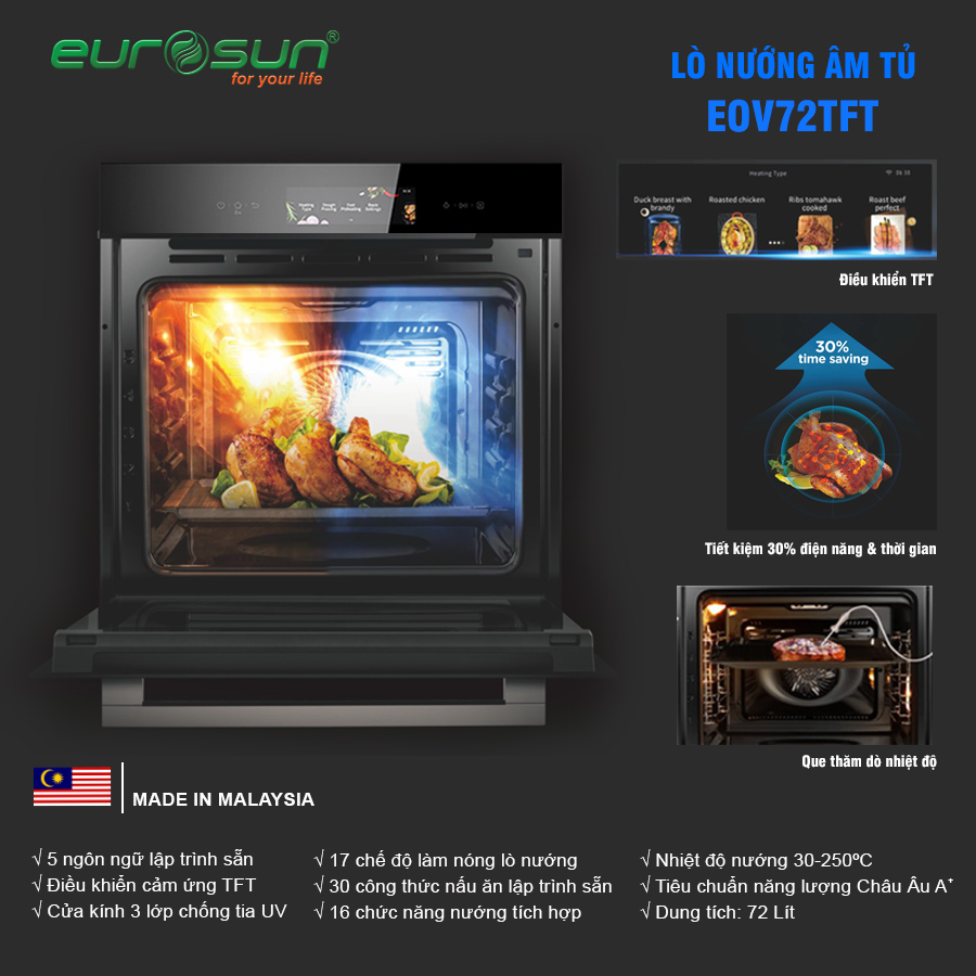 Lò nướng Eurosun EOV72TFT là một thiết bị nhà bếp hiện đại, được nhập khẩu từ Malaysia. Thiết bị nhà bếp này nổi bật về cả thiết kế lẫn các tính năng sử dụng. Mang đến sự tiện lợi và hài lòng cho khách hàng. Sản phẩm lò nướng Eurosun EOV72TFT chính hãng được thiết kế hệ thống bảng cảm ứng nên vô cùng dễ dàng khi sử dụng.