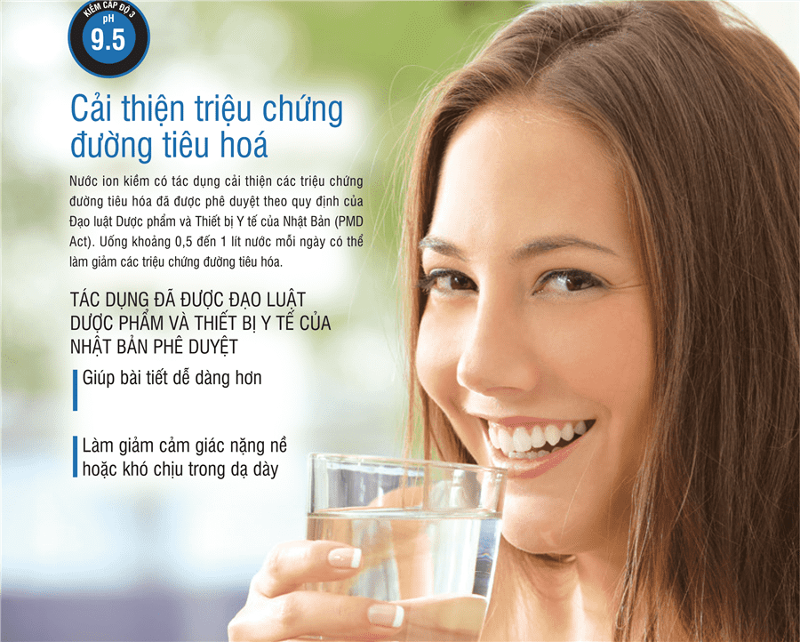 Đối với người bị các bệnh về trào ngược dạ dày, ợ chua, dư axit, táo bón, khó tiêu, uống nước ion kiềm giúp trung hòa axit dư, đảm bảo cơ thể khỏe mạnh và tăng cường hỗ trợ hấp thụ thức ăn, chất dinh dưỡng.