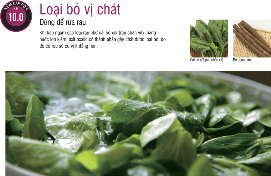 Đặc biệt, nước ion kiềm mạnh (nước kiềm mạnh) pH 10.0 có thể có bóc tách thuốc trừ sâu, thuốc bảo vệ thực vật, chất bảo quản trên bề mặt rau, củ, quả.