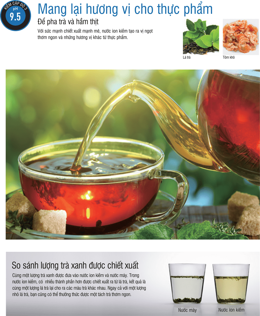 Nước ion kiềm có PH-9.5 dùng nấu thực phẩm, làm mềm thức ăn hiệu quả. Nước ion kiềm thẩm thấu qua thức ăn tốt hơn các loại nước khác, và có tác dụng đặc biệt như tạo hương vị và làm thức ăn trở nên mềm hơn.