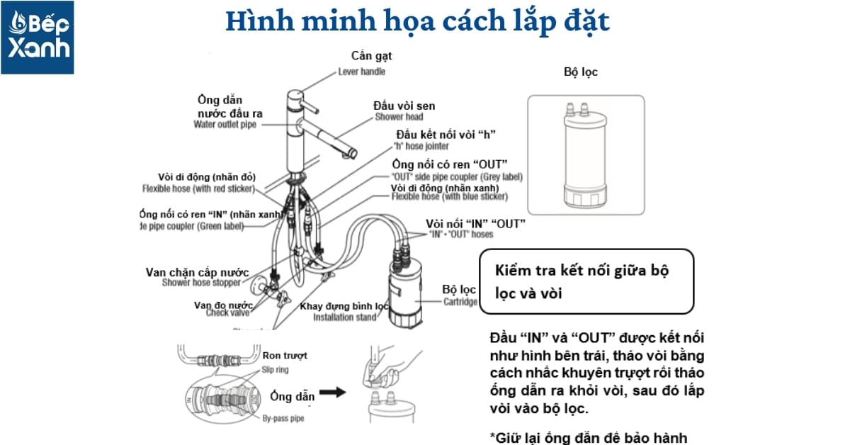Nhìn chung, cách lắp đặt máy lọc nước EU202 khá dễ dàng, Bếp Xanh sẽ hướng dẫn các bạn cách lắp đặt như hình sau: