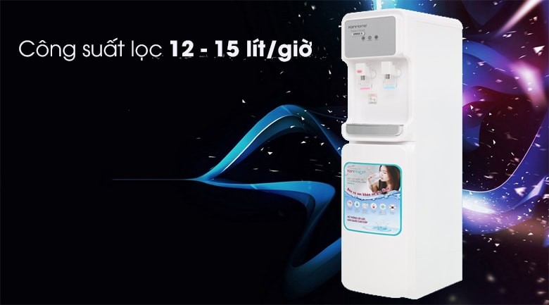 Công suất lọc nước mạnh mẽ 12-15 lít/h. Dung tích bình chứa 5,8 lít với 2 lít nước nóng và 3,8 lít nước lạnh.