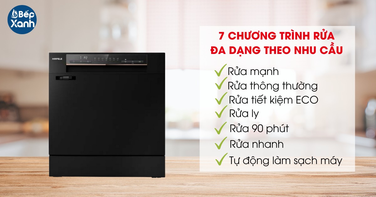 Máy rửa chén độc lập của Hafele đã được thiết kế với sự hiện diện của 7 chương trình rửa tự động khác nhau, giúp người dùng dễ dàng lựa chọn tùy theo mức độ dơ bẩn và chất liệu của các vật dụng như chén, đĩa, ly, và nhiều loại khác. Cụ thể, các chương trình bao gồm: - Rửa mạnh