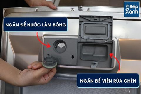 2 hộc được bố trí ở mặt trong nắp máy, cơ chế đóng mở tiện lợi giúp bạn dễ thêm viên rửa chén và nước làm bóng khi cần thiết.