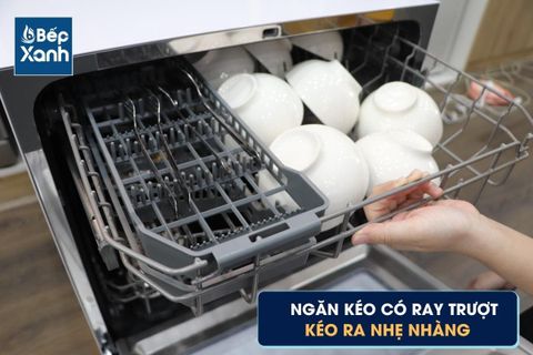 - Ngăn trên của máy rửa chén dùng để sắp chén, tô nhỏ, ly nhỏ. Ngoài ra còn có 2 khay phụ để đặt muỗng, nĩa, thìa canh,... để chúng cố định tốt hơn trong khi rửa.