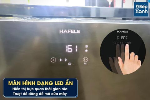 Mặt trước máy r���a bát Hafele là màn hình LED hiển thị thời gian rửa, báo muối, nước làm bóng và các thông số khác tuỳ theo chương trình rửa mà bạn chọn. Ngoài ra, mặt trước còn có 2 phím cảm ứng là nút nguồn và nút khởi động chương trình rửa, bạn có thể vuốt từ trái sang phải để máy tự mở cửa mà không cần phải dùng tay kéo cửa như các dòng máy khác.